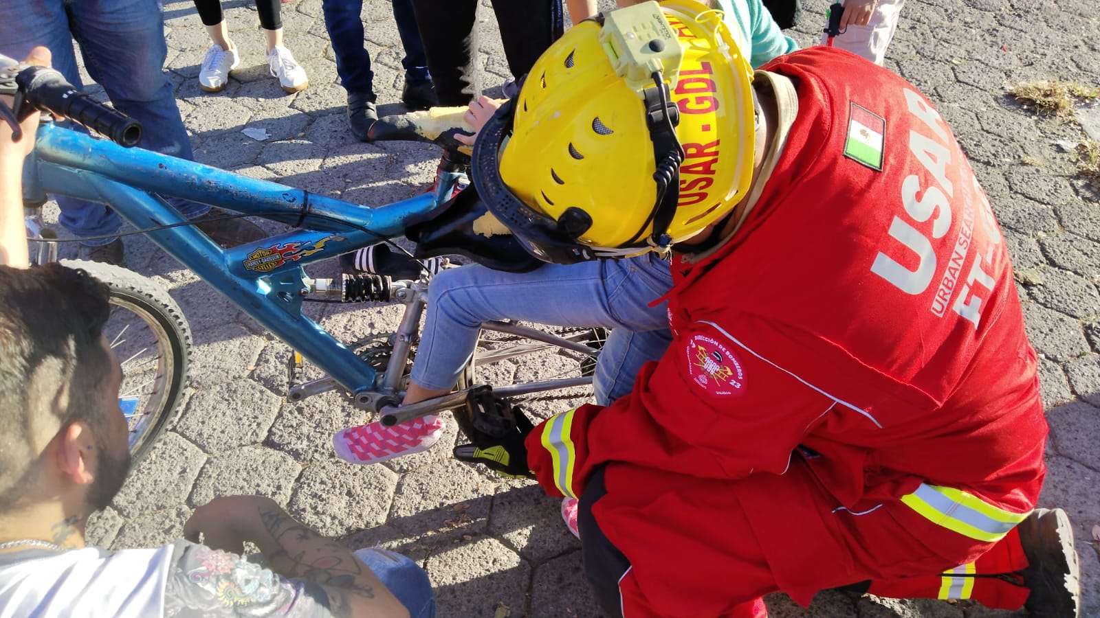 En Río Juárez y Torrecillas en la colonia el Rosario, Bomberos de Guadalajara dieron atención a una menor de 8 años la cual al estar jugando en una bicicleta sufrió un percance ocasionado q una de sus extremidades quedara atrapada entre el pedal y el cuadro de la misma… procedimiento a realizar maniobras con equipo hidráulico para su liberación…se brinda la atención prehospitalaria. Familiares la trasladan al servicios médicos para descartar algúna posible fractura.